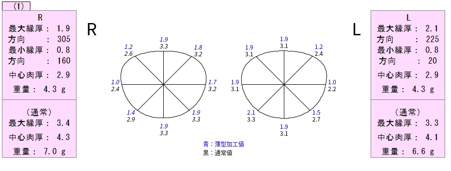 レンズの端の厚みに関しては一番外側(耳側)の数字が上段が1.0mm下段が2.4mmですね