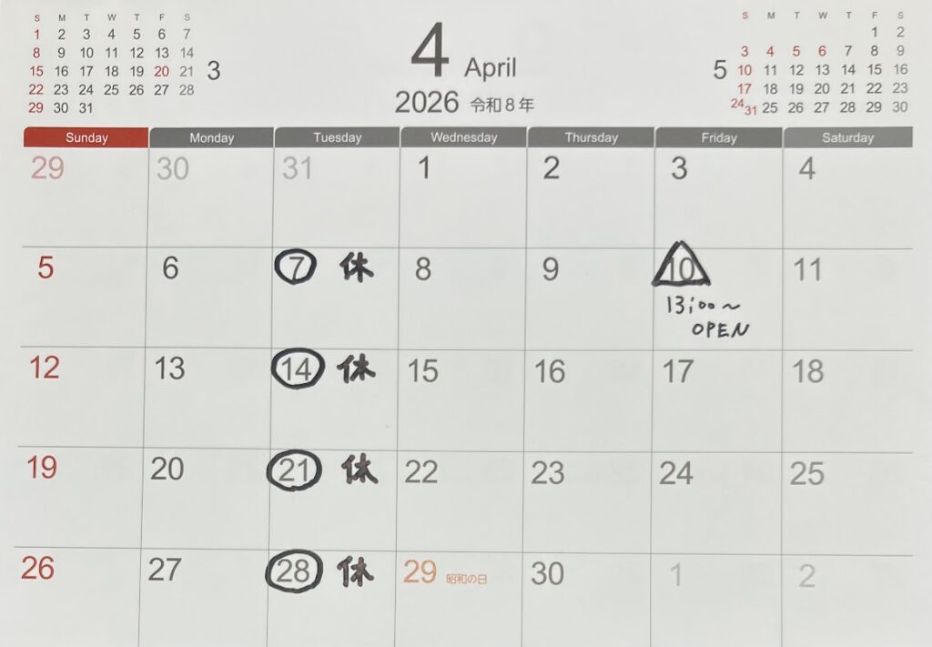 4月の店休について 2026年3月30日 新着情報, 未分類 いつも有り難うございます 2026年4月の店休は毎週火曜の定休のみで7(火)、14(火)、21(火)、28(火)です ※4/10(金)は営業時間を変更させて頂き 13:00~の営業とさせて頂きます よろしくお願い致します Tag : コンタクトレンズ, つくばみらい市, メガネ, 取手市, 営業時間変更, 守谷市, 定休日, 常総市, 補聴器 << 眼鏡紹介(EYEVAN) カテゴリー BJ CLASSIC CLAYTON FRANKLIN EYEVAN MASUNAGA omodok REAL アフターフォロー お手頃価格の補聴器 サングラス・スポーツメガネ その他サービス その他商品 フェリーチェなBLOG メガネ メガネ・補聴器 訪問販売 メガネクリーナー・くもり止め メガネチェーン・ストラップ メガネレンズ メガネ用 後付けサングラス 修理・アフターサービス 個性を生かす納得のメガネ 充電式補聴器取り扱い 子供用メガネ 新作メガネ 新着情報 日本製メガネ 最新デジタル機種取り扱い 未分類 耳掛け式、耳穴式、 ポケット型、各種取り扱い 聴力測定可能 補聴器 補聴器関連(電池など) 関連商品 最新の投稿 4月の店休について 眼鏡紹介(EYEVAN) 自分のために 眼鏡紹介(EYEVAN) 眼鏡紹介(EYEVAN) カレンダー 2026年3月 月 火 水 木 金 土 日 1 2345678 9101112131415 16171819202122 23242526272829 3031 « 2月